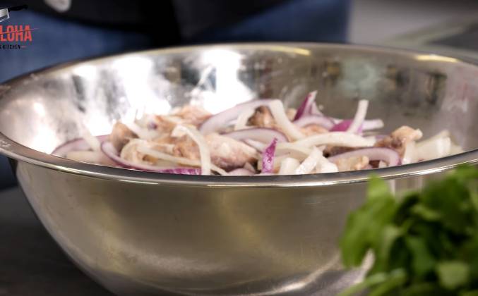 4. Для начала нам нужно будет нарезать лук. Я для цвета взял часть красного и обычного репчатого лука. Нарезаем лук полукольцами. Не сильно тонко. Потому что он у нас будет мариноваться. В Хе лучок как раз такой получается. Промаринованный самый вкусный. Количество лука на это количество рыбы - это немного. Он с процессе промаринуется и его будет практически незаметно. 3 луковицы я отправлю к рыбе сырыми, одну обжарю в масле. Это не обязательно делать, но мне нравится с маслом. Для обжарки я нарежу четверть кольцами. Лучше поменьше, чтобы он у нас так разжарился и не сильно заметен был. Лук отправляем в наш Хе. Ставим сковороду на плиту. На это количество рыбы нам понадобится 6 ложек растительного масла. Отправляем наш лучок. Пока обжаривается наш лук, перемешаем рыбу с луком. Делать это удобнее руками. Когда я обучался подмосковье в одном учебном заведении, с нами тогда на сессии присутствовал мой коллега из Бурятии.