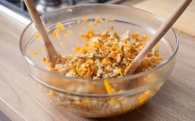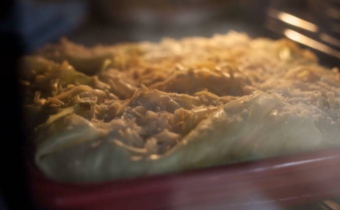 3. Фарш с овощами поделить на 3 части. Одну часть переложить на капустные листы в форме и равномерно распределить по поверхности. Посыпать начинку горстью сыра и большой горстью панировочных сухарей, сверху положить 2 листа капусты. Панировочные сухари уберут лишнюю влагу совет от шефа На листья капусты положить вторую часть начинки и равномерно распределить по поверхности. Посыпать горстью сыра и горстью панировочных сухарей, сверху накрыть 2 листами капусты.