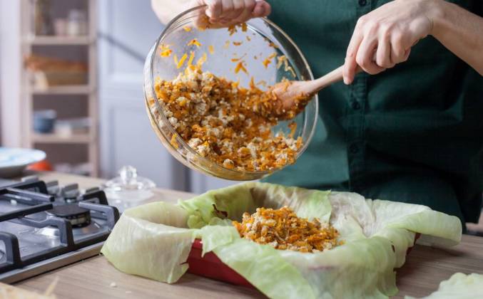 2. У капусты вырезать под углом кочерыжку и убрать верхние вялые листья. Отправить целый кочан капусты в кипящую воду на 5 — 10 минут, постоянно поливая кочан кипятком сверху и в центр. Оторвать первый мягкий лист, срезать утолщённые прожилки и слегка отбить твёрдые места молотком. То же самое проделать с остальными 12 — 14 листами капусты. Натереть на крупной тёрке сыр. Выложить 1 слой из 4 листьев капусты, расположив их по бортам и краям формы, чтобы тонкая часть листа торчала наружу (оставить запас листьев по краям). Один лист положить в центр, спрессовать руками.