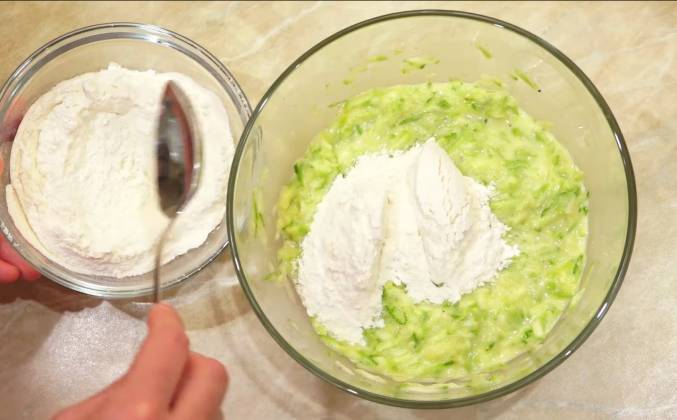 2. Добавляю две столовые ложки сметаны. Натираю два зубчика чеснока. Солим, перчим. И перемешиваем. Возвращаемся к нашим кабачкам. Кабачки отжимаем. И хорошо все перемешиваем. Хорошо перемешав мы добавляем 4 столовые ложки с горкой муки. И перемешиваем. Вот такое тесто на чебуреки у нас должно получиться. Вливаем на сковороду растительное масло. Выкладываем нашу смесь на сковороду, хорошо разравниваем. Закрываем крышкой.