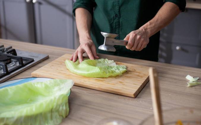 2. У капусты вырежем кочерыжку и убираем верхние листочки. Отправляем целый кочан в кипящую воду на 8 мин., постоянно сверху наливаем кипятк. Отрываем первый мягкий листок, режем утолщённые прожилки и немножко отбиваем твёрдые части молотком. То же самое проделать с остальными 12-14 листами капусты. Натереть на крупной тёрке сыр. Выложить первый слой из четырех листочков капусты, расположив их по бортам и краям формочки, чтобы тонкая часть листа торчала наружу. Один лист положить в середину, надавить руками. Фарш с овощами поделить на три равных части. 1 часть переложить на капустные листы в формочке и распределить.