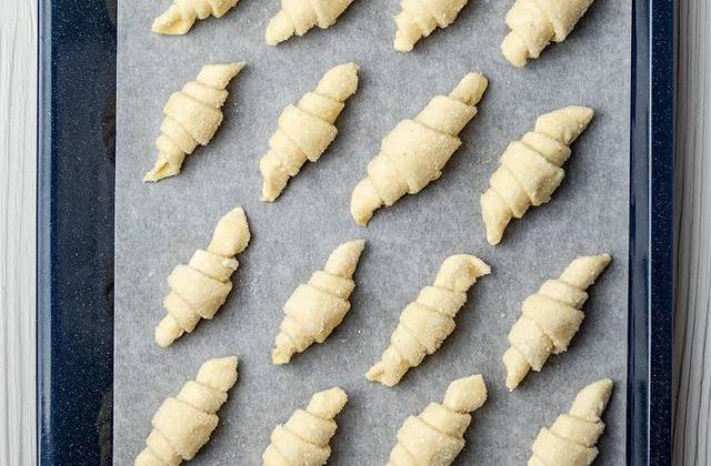 3. Каждую часть плотно свернуть в рогалик, затем обвалять его в сахаре и выложить на противень, застеленный бумагой для выпечки. Повторить те же действия со второй частью теста. Всего получится 32 рогалика. Выпекать рогалики в заранее разогретой до 180 градусов духовке 23-27 минут до красивого золотистого цвета.