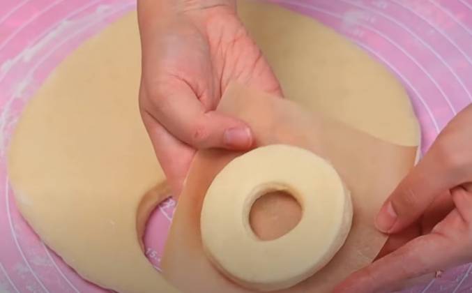 2. Затем раскатаем скалкой и выдавим формочкой. Заранее вырежем из бумаги для запекания квадратики и поместим на них пончики. Накроем еще раз целлофаном и дадим постоять 20 минут, чтобы тесто немного поднялось. Далее в нагретое масло опустим пончики вместе с бумагой. Через 3-5 сек. Бумагу уберем. Тем самым пончики не будут деформированы.
