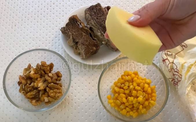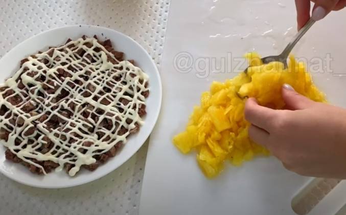 Салат с ананасом, мясом, орехом, сыром и майонезом
