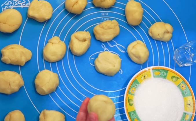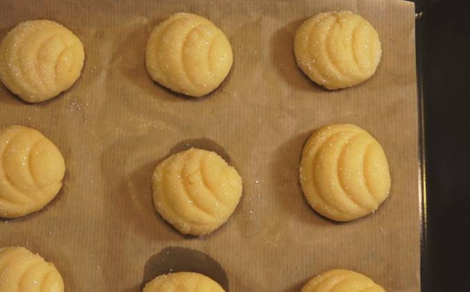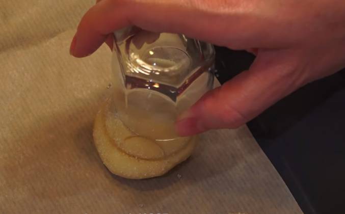 3. Верх обмакиваем в сахар. И выкладываем на противень, который я уже застелила пергаментом. Слегка придавливаем. И маленьким стаканчиком делаем вот такие узоры. Печенье я выкладывала на приличном расстоянии друг от друга. Сантиметров вот тут 2 или 1,5 где то так. Они будут увеличиваться в объеме. Сейчас мы их ставим в разогретую духовку до 180 градусов. И будем выпекать минут 25-30, но все конечно зависит от вашей духовки. Печенье к чаю готово.Видео рецепт ютуб ниже 👇