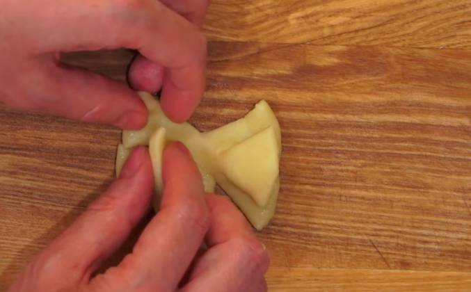 2. Беру половину теста. Так будет удобнее. Лишнюю муку убираем. И раскатываем. Раскатав тесто, я с помощью стакана, можете взять любую форму, выдавливаю кружочки. Диаметр стакана у меня 7,5 сантиметра. Вот такие кружочки. Берем кружочек. Делаем ножом надрезы. И формируем бантик. Выкладываем на противень, который я уже застелила пергаментом.