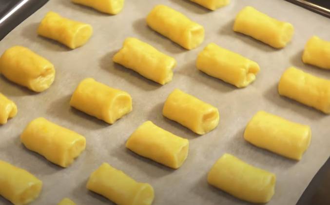 3. Нарезаем кусочками длиной около 4-5 сантиметров. Выкладываем на противень, который я уже застелила пергаментом. И ставим в разогретую духовку до 180 градусов. На минут 15-20. Но все зависит от вашей духовки. Вот такое аппетитное молочное печенье у нас получилось.Видео рецепт ютуб ниже 👇