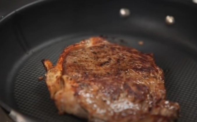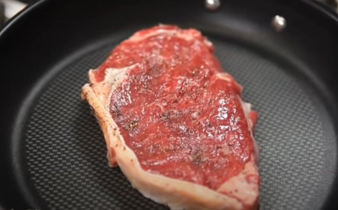 2.  Возьмите мясо и просто положите на сковороду...Вот так. Не волнуйтесь, масла на стейке достаточно для жарки. Мясо не прилипнет. Важно, чтобы ваша сковорода была с толстым дном. На такой сковороде стейк лучше прогревается. и он также не сможет остудить саму сковороду, как обычно случается. Возьмите щипцы и убедитесь в том, что мясо плотно прилегает к сковороде. Вот так... Все, что вам остается делать это переворачивать мясо каждую пару минут. Время приготовления зависит от того, какой степени прожарки вы хотите стейк. Стейк средней прожарки я рекомендую готовить примерно 8 минут, переворачивая мясо каждую минуту.