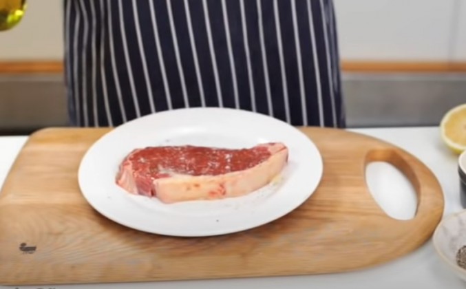 3.  Должно немного подрумяниться снизу. Еще немного и пора переворачивать. И снова. Прижмите стейк щипцами убедитесь в том, что мясо хорошо прилегает к сковороде Не ворочайте мясо по сковороде, просто дайте ему прожариться - тогда он будет сочным снаружи. Это и делает вкус мяса восхитительным. Захватите мясо и немного обжарьте края - так они станут немного хрустящими. А так приятнее есть. Видите таящий жир? Готово. Видите разницу? Почти готово. Еще немного поджарим края Вот так. Прошло уже 6-7 минут. Еще минута и готово. Я знаю, что мясо еще готовится, когда слегка нажимаю на него; я чувствую, насколько оно плотное, как хорошо оно прожаривается. Готово. Положите стейк на тарелку. Немного сока лимона и оливкового масла Оставьте мясо на тарелке на пару минут, - все готово.Видео рецепт ютуб ниже 👇