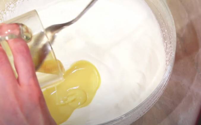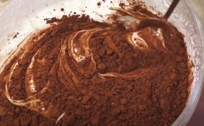 2. Теперь к этой массе добавляем 35 грамм какао-порошка. Я сначала перемешиваю ложкой. Перемешиваю миксером на малых оборотах. Готовую смесь перекладываем в емкость, которую мы будем замораживать. Закрываем крышкой и ставим в морозильную камеру на 4-6 часов.