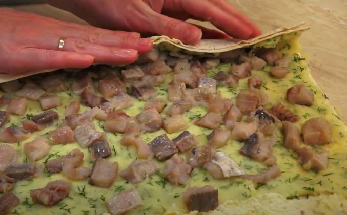 Рулет из лаваша с картошкой и сыром с селедкой