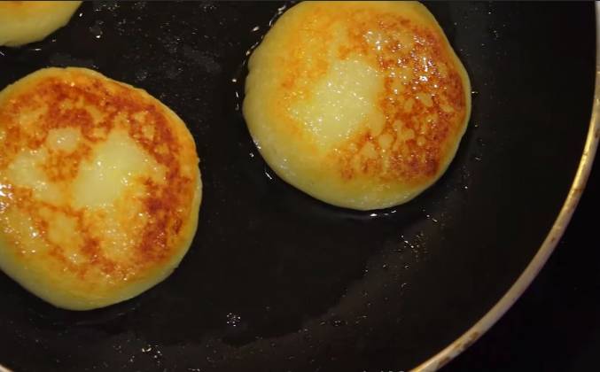 3. На разогретую сковороду наливаю растительное масло. Выкладываем так, чтобы их было хорошо переворачивать. Жарим около 4 минус одной стороны и потом столько же с другой. У нас получились вот такие замечательные картофельные оладьи с румяной корочкой. Их очень просто готовить. Они получаются нежными и вкусными. Подавать к столу их лучше теплыми. Пока сырная начинка внутри не застыла.Видео рецепт ютуб ниже 👇