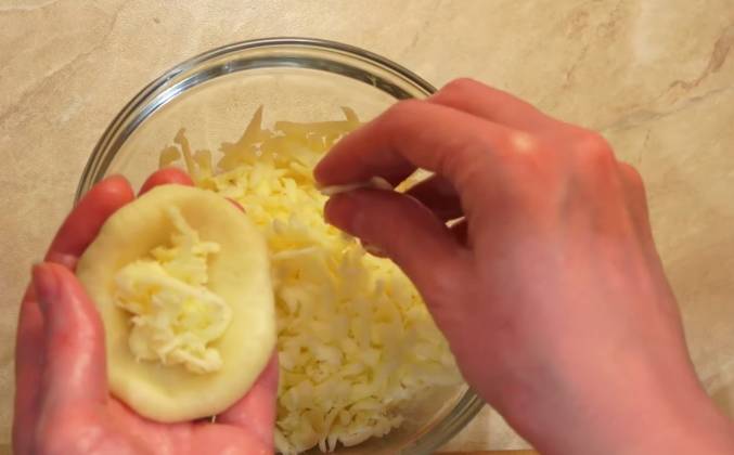 2. Оно должно у вас собираться в вот такой комок. Руки я смазала растительным маслом. Сейчас буду формировать кружочки. Теперь помещаем в середину сыр. И вот так защипываем края. Делаем вот такие кружочки. Теперь их вот так сплющиваем. В середину кладём сыр. И собираем вот так края в средину.