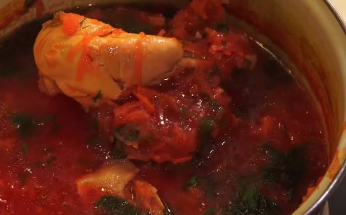 3. Тем временем в борщ я наливаю 250 миллилитров томатного сока. И дальше варю. Теперь свеклу натираю на маленькой терке. Солю по вкусу. Нарезаю зелень. И мелко нарезаю чеснок. И в конце добавляю чеснок и зелень. И через 2 минуты выключаю. Снимаем с огня и дадим ему немного настояться. К борщу я добавляю сметану.Видео рецепт ютуб ниже 👇