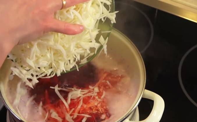 2. Жду пока закипит, потом закрываю крышкой и ставлю на средний огонь. Нарезаю соломкой капусту. Капусты у меня получилось 250 грамм. Борщ варится у меня на среднем огне под закрытой крышкой. Морковь средних размеров натираю на большой терке. Одну небольшую луковицу нарезаю мелко. Теперь мелко нарезаю картофель. У меня 6 штук весом 400 грамм. Борщ у нас кипел уже 10 минут, теперь мы выставляем на 40 минут, на среднем огне. Свекла у нас сварилась, мы ее достаем. И окунаем в холодную ледяную воду.