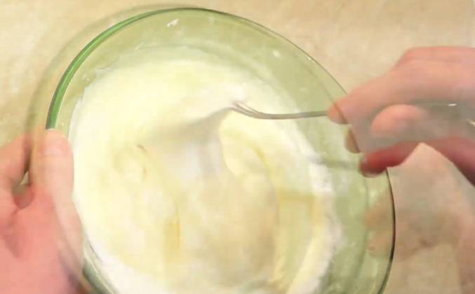 2. Теперь я белки буду взбивать миксером, когда появится пена, я буду добавлять сахар. Сахара у меня 25 грамм. Взбивала я минуты 3 до пышной пены. Вот если мы поставим ложку, то пена должна ее держать. Все у нас получилось взбить хорошо белки, теперь берём наши желтки и добавляем их к белкам. И круговыми движениями начинаем хорошо все перемешивать. Теперь хорошо перемешав, будем выпекать их на сковородке. Так, теперь я вам покажу какие формы я вырезала из пергаментной бумаги. Это просто полоски, у меня высота 5 сантиметров. Сейчас с помощью растительного масла я их буду скреплять. Я специально вырезала их большими, чтобы можно было дважды вот так, чтобы они держали форму, видите, дважды получается я сделала кольцо, тут еще так домазывать и все. Такая форма.