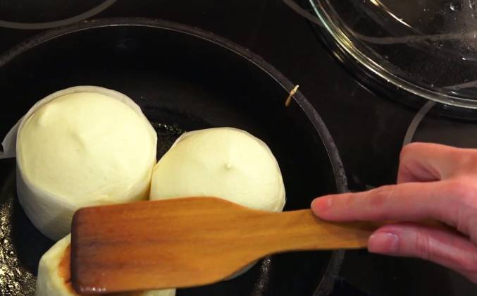3. Так сейчас я ставлю на разогрев сковородку. Смазываю растительным маслом и выкладываю в формы. И так следующие делаем. Три формы у меня готовы. Сначала у меня сковородка разогревается на большом огне потом я выставляю средний. Теперь с помощью десертной ложки я аккуратно выкладываю нашу смесь в эти кольца. Так, теперь подливаю немножко воды и оставляю их на среднем огне под крышкой на 6 минут. Шесть минут прошло, так смотрите как они увеличились, сейчас попробую их перевернуть. У меня сковородка не очень конечно. И они прилипли, так, тут самое... Самый такой момент. Так, можно даже его развернуть. Красатульку, так, теперь второй. Так, все. Если у вас хорошая гладкая сковородка у вас должно получиться отменно.