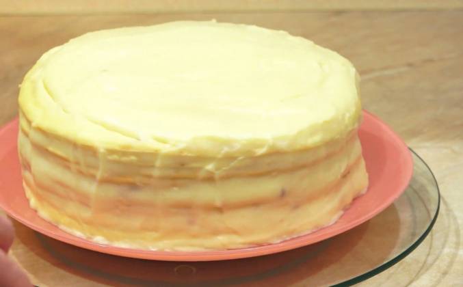 4. Вот видите и от моего венчика остаются следы. Крем у нас готов. Мы его снимаем с огня. Вот такой у нас крем получился. Посмотрите какая у неё консистенция. Бросаем сюда масло. Перемешиваем и добавляем сахарный ванилин, хорошо перемешиваем. Оставляем крем до полного охлаждения. Наш крем остыл перемазываем коржи. Посыпаем немного орехами. Мы намазали все коржи, благодаря лопатке я делаю ровный круг. Торт ставлю в холодильник на ночь, чтобы он пропитался, а крем зафиксировался и чтобы крошка не поплыла, по этой причине я его не украсила. Уже утро наш чудный торт я вынула с холодильника. Он имеет вот такую красивую форму, сейчас я его буду украшать. Этот торт не только имеет изумительный вид, но и легко готовится с простых продуктов. Диаметр его 20 сантиметров высота 9 сантиметров и весом он вышел 1 килограмм 800 грамм.Видео рецепт ютуб ниже 👇