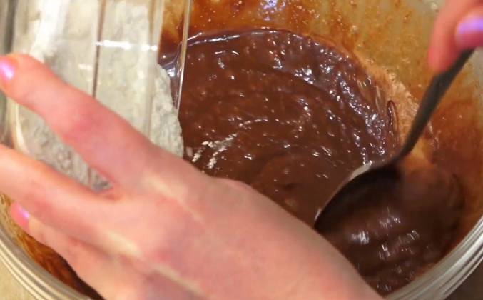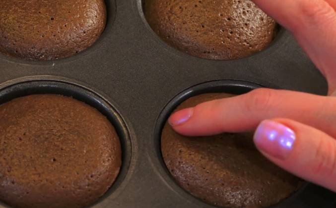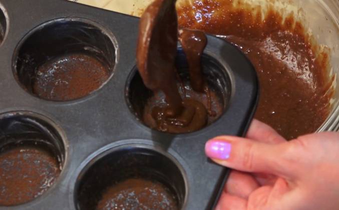 2. Наша смесь готова, вот она такая чуть жидкая получилась, хорошо вот так тянется. Мы взяли металлические формы, они вроде как луночками для кексов. У вас если есть керамическая форма и поштучно, лучше конечно взять ее. Мы берем масло, я его чуть-чуть заморозила, в морозильной камере, чтоб хорошо было натирать формочки. Берем какао. И немного притрушиваем каждую формочку. Все лишнее я убираю салфеткой. Берем ложку и аккуратно, можно сказать наливаем в формочки. [смех] Старайтесь конечно аккуратно я все это дело уберу. У меня шоколадной массы хватило на 5 формочек, сейчас мы ставим в разогретую духовку до 180С. На 5-9 минут, в этом промежутке от 5 до 9 минут нужно следить, потому что духовка у каждого разная.