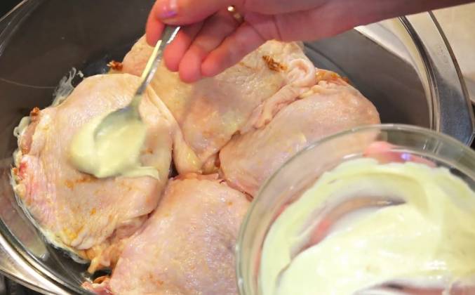 2. Перемешав, мы намазываем внутренности бедрышек. И выкладываем, у мне такая стеклянная посуда. Тоже делаем с другими бедрышками. И мажем их сверху. Эту всю красоту мы отправляем в духовку, разогретую до 180С на 30-40 минут. Прошло 40 минут и наши бедрышки с невероятным запахом по всей квартире готовы.