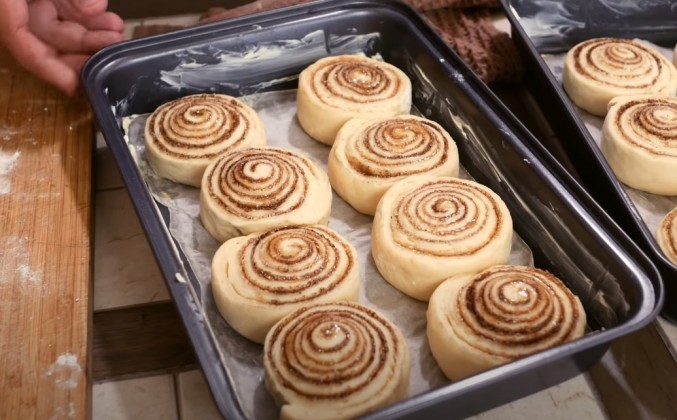 6. Шириной примерно по 1,5-2 сантиметра. В форме для запекания у меня пергамент на дне. Края я смазываю сливочным маслом. Выкладываем булочки. Они еще поднимутся, поэтому выкладываем на расстоянии друг от друга. В одной форме будет 8 булочек. Во второй будет 6. Пока мы работали с тестом. Из теста вышел весь воздух. И надо дать булочкам снова расстояться Накрываем снова влажными полотенцами. И оставим минут на 20-30 Он довольно хорошо выросли. Булочки будут выпекаться при 190 градусах 20-30 минут до золотистого красивого цвета. Посмотрите, у нас такие серединки выросли.