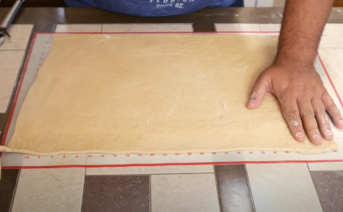 4. Тесто вышло пышное! Мы можем приступать уже к формированию самих булочек. Один из самых приятных моментов в сегодняшнем ролике. Давайте еще раз сложим тесто несколько раз. Тесто всегда нужно поскладывать растягивая. Настало время скалки. Задача раскатать в пласт толщиной 3-4 миллиметра В принципе тесто уже довольно тонкое. Можно наверно еще потоньше Все! Пойдет! Я немножко подровняю края просто чтобы у нас получился действительно прямоугольник У нас практически ровный кусок теста Когда тесто готово, сделаем начинку из масла, сахара и коррицы.