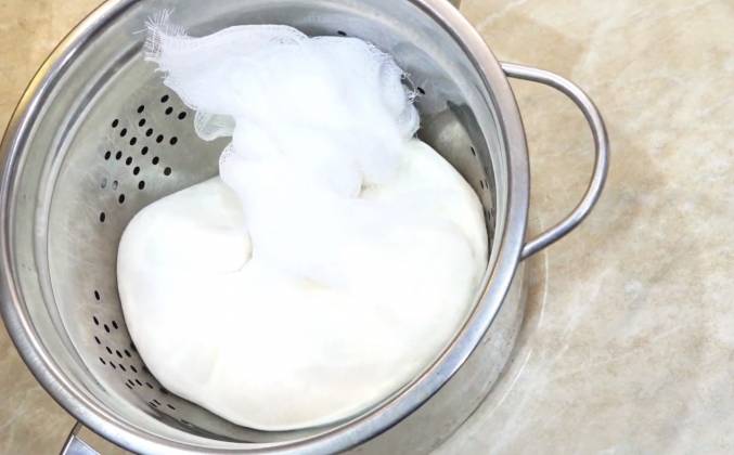 2. И ставим на сутки в холодильник. Прошли сутки мы достали из холодильника наш сливочный сыр. Сейчас будем разбирать конструкцию. Будем смотреть на его текстуру, пробовать и взвешивать. Так как у меня дуршлаг с ножкой в результате чего хорошо отделялась сыворотка. Вот сколько сыворотки у нас получилось. Высыпаем сыр в миску и взвешиваем. У нас на выходе получилось 300 грамм. Напомню, вначале мы взяли 600 грамм ингредиентов. И сливочного сыра на выходе получилось 300 грамм.