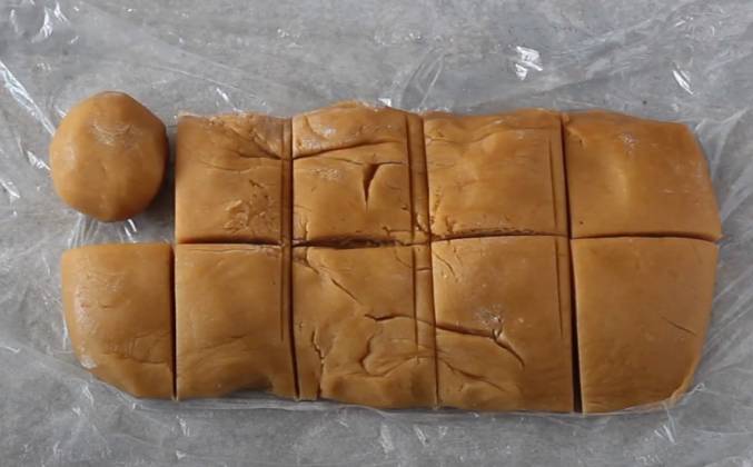 3. Всыпать большую часть муки, вмешать. Постепенно ввести всю муку. Тесто будет липнуть к рукам, но после охлаждения станет податливым. Завернуть тесто в пищевую пленку и положить на час в холодильник. Поделить тесто на необходимое количество частей.