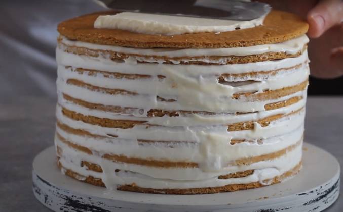 4. У меня получилось 10 коржей диаметром 16 см. Выпекать на 180 С до румянца около 5 минут. Из горячего коржа, пока он мягкий, сформировать круг нужного диаметра. Можно сразу вырезать кольцом, можно тарелкой и ножом. Испечь все коржи