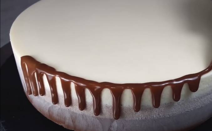 2. Масса должна получиться полностью однородной. Если шоколад не полностью растопился с первого раза, прогрейте еще несколько секунд в микроволновке. Переливаем ганаш в небольшой кондитерский мешок, завязываем его и достаем охлажденный торт из холодильника. Срезаем край кондитерского мешка, чтобы получилось отверстие приблизительно 3 миллиметра. Сейчас главное не торопиться и сделать сначала пробный подтек. Если струйка сильно стекает, значит ганаш слишком жидкий.