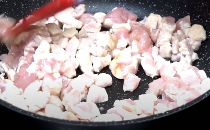 2. Теперь закрываем крышкой, как мясо начнет выделять жидкость добавляем соль, половину чайной ложки и чёрный перец по вкусу, перемешиваем и закрываем еще раз крышкой и готовим до испарения жидкости, теперь крышку снимаем и жарим мясо до легкой золотистости, снимаем с огня и даем ему полностью остыть, отварной картофель, отварную морковь, отварные яйца порежем кубиками, берем один большой свежий огурец и порежем его кубиками, можно взять маринованный огурец, получается тоже очень вкусно.
