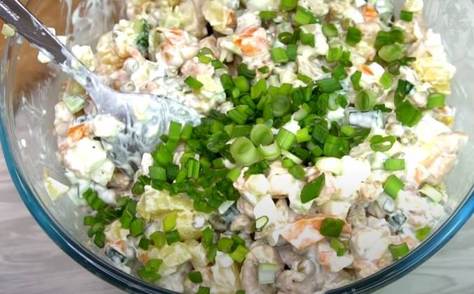 3.  Собираем салат, в миску кладём картофель, морковь, добавляем яйца, охлажденное мясо, огурец, зеленого горошка, сливаем жидкость и добавляем салат, заправляем майонезом, я заправляю домашним майонезом, как я его готовлю, я уже делилась ранее, зеленый лук мелко порубим и добавим в салат, все перемешиваем ещё раз, пробуем на соль, если нужно добавляем чёрный перец по вкусу, готовый салат кладем в салатник и украшаем, я сверху посыпаю нарезанными свежими огурцами и кладу веточки укропа.Видео рецепт ютуб ниже 👇