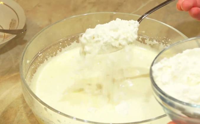 3. Вы можете взбивать отдельно желтки и отдельно белки, но так как я уже знаю что у меня получится очень хорошая густая сметанообразная масса, я взбиваю это все вместе. Теперь сюда ссыпаем нашу муку. Чуть-чуть муки сверху осталось, сюда мы гасим соду, вы можете взять разрыхлитель, но я использую лимонную кислоту выдушеную из лимона. И не спеша перемешиваю. Тесто наше перемешали, теперь мы будем вливать его в форму.