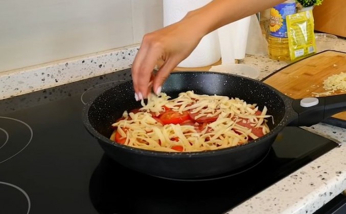 4.  Пока натирали сыр, прошло буквально две минутки, и сейчас уже последний этап. Щедро засыпаем верх пиццы сыром, и затем отправляем пиццу прямо на сковородке в духовку. В этом и есть секрет приготовления этой пиццы - она готовится на сковородке, но благодаря тому, что будем ее запекать, получается прямо самая настоящая пицца.  Я поставила в духовку минут на десять, при температуре 180 градусов. Следите чтобы сыр полностью расплавился, и аккуратно перекладываем в тарелку для подачи нашу пиццу, еще горячую.  Начинку можно абсолютно любую - можно просто сделать сырную, можно добавить рукколу, можно добавить оливки, можно любые ваши любимые ингредиенты!Видео рецепт ютуб ниже 👇