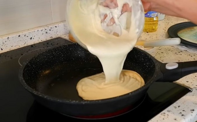 2.  Отправляем всю эту массу на сковородку при средне-сильном огне. Будем жарить под крышкой.  На сковородку я выделила уже одну столовую ложку растительного масла, этого будет достаточно. Можно жарить на оливковом ,можно жарить вообще без масла, если у вас хорошая сковорода. Но все-таки, это пицца - она жирненькая. Будем жарить на масле. Равномерно распределяем тесто, накрываем крышкой и займемся начинкой.