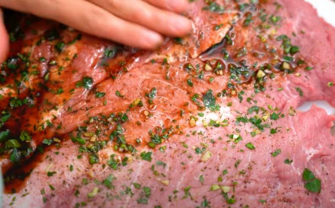 2. Вот такой большой пласт мяса у меня получился и теперь мы сделаем для него маринад. Берем два зубчика чеснока и мелко его нарезаем. Так же измельчаем немного петрушки. Мясо перчим. Посыпаем петрушкой и чесноком. Все, блюдо готово, зовите друзей. Шучу! Готовим дальше! Теперь можно посолить по вкусу или использовать соевый соус. Я добавлю шесть столовых ложек соевого соуса. И втираем его. Мясо оставляем промариноваться на 30 - 60 минут при комнатной температуре.