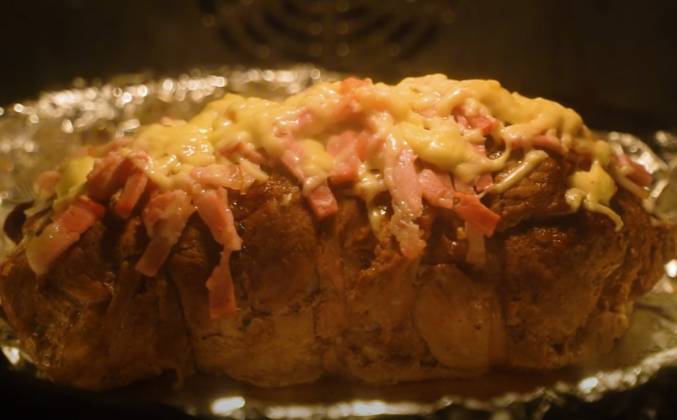 4. Мясо перекладываем в рукав для запекания. И выпекаем его полтора часа при температуре 190 градусов Цельсия. Снимаем нитки. Смазываем мясо соевым соусом. Немного перчика. 50 грамм копчёного бекона выкладываем сверху. И немного сыра (20 граммов), чтобы он зафиксировал бекон. И отправляем в духовку на 40 минут. Советую запекать это мясо в рукаве 1 час, а потом раскрыть рукав и запекать минут 30. Чтобы рукав не лопался вы можете его проткнуть. Посмотрите какое оно получается внутри. Сочное. Пробуем. Очень вкусно. Мясо не сырое не переживайте.Видео рецепт ютуб ниже 👇