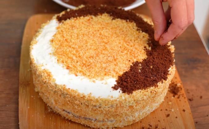 5. Шоколадный сверху. Раскрываем. Смазываем сверху. Измельчаем остатки коржей блендером. Произвольно украшаем крошкой. Шоколадной крошкой, и снизу. Торт пропитывался 2 часа и теперь разрежем, посмотрим какой он внутри. Очень мягкий. Посмотрите какой красавец. Идеально. Очень вкусно. Сбалансированный вкус, слегка кислый от сметаны, влажные коржи. Знакомый вкус из детства. Готовьте очень хороший рецепт. Всем пока!Видео рецепт ютуб ниже 👇