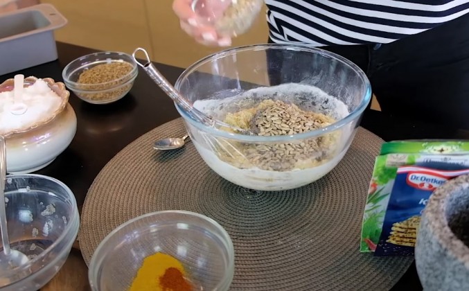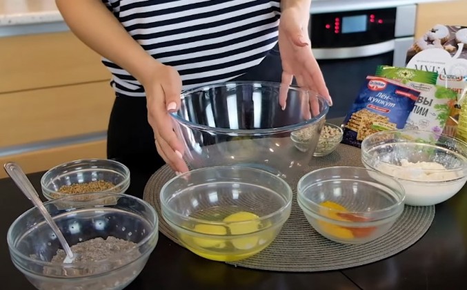 2. Добавляем оливковое масло, и дабы придать интересную структуру для хлеба, я буду использовать перемолотые семена кунжута и льна, тыквенные семечки и обычные семечки (они тоже без глютена), идеально подойдут для хлеба. Еще цвета добавлю хлебу - это куркума и сладкий молотый перец. Мы сейчас просто все смешаем, выложим в формочку, отправим запекаться, и наш хлеб будет готов. Яйца отправляем в миску и взбиваем их щепоткой соли до однородной консистенции, сюда же отправляю творог. Если вы по каким-то причинам не едите лактозу, можно добавить тофу, вместо творога. Или же наоборот, добавить сметану или натуральный йогурт и еще раз перемешиваем до однородной консистенции. Я взбила все блендером.