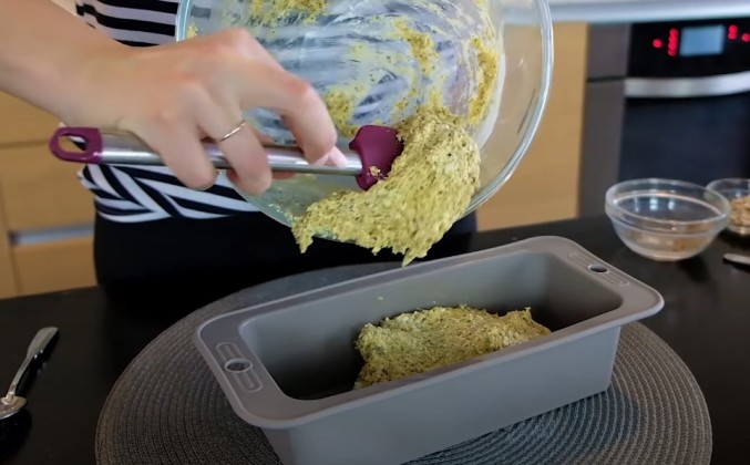 4. Когда тесто и замешали до однородной структуры, можно сразу перекладывать его форму для запекания. Я буду использовать форму для кекса. Тесто достаточно плотно получается густым, а можно по желанию сделать более влажным, и добавить побольше жидких ингредиентов. Но я именно хочу чтоб получилась такая структура полусухая. Хлеб равномерно распределяем по форме для запекания, чтобы при процессе приготовления у нас равномерно хлеб испекся. Давайте вам покажу лайфхак: то есть мы с центра немножко убираем хлеб, по бокам так как он все равно будет подниматься достаточно. При запекании я хочу чтобы он получился у нас достаточно ровной формы, прямо так, по бокам. Сверху я еще посыплю семенами подсолнечника. Также добавлю сверху для красоты. И отправляем запекаться примерно на 50 минут, при температуре 180 градусов.