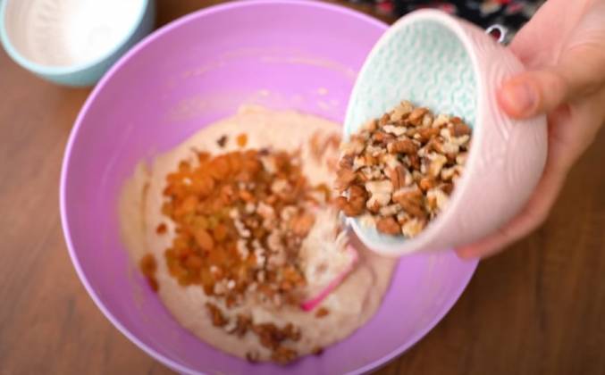 2. Также если вы сладкоежка, то добавьте чуть больше сахара. Вы можете добавить 20 граммов ванильного сахара, как сделала я, и еще добавить обычный сахар, приблизительно граммов. И последние ингредиенты: 70 граммов изюма и 70 граммов обжаренного грецкого ореха. Перемешиваем тесто. Можно смазать форму сливочным маслом и посыпать мукой. Банановый хлеб не прилипнет в форме. В моей форме дырочка, поэтому я использую пергамент для выпечки с антипригарным покрытием. Тесто перекладываем в форму, оно уже сейчас невероятно пахнет бананами и ванильным сахаром. Размер формы 22 см на 10 см.