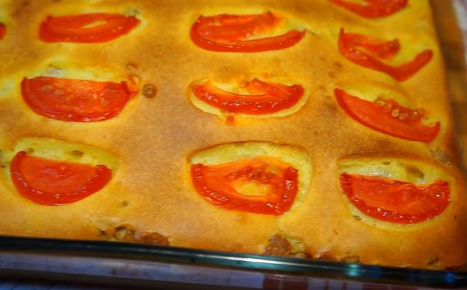 2. Всыпаем 300 грамм муки. Добавляем пол чайной ложки соды. Тщательно всё перемешиваем. Добавляем 3 столовые ложки подсолнечного масла. И снова всё перемешиваем. Получается вот такое быстрое бездрожжевое тесто. Теперь нам нужно нарезать на дольки 2 помидора. И вот все ингредиенты уже готовы. Берём форму для выпечки и смазываем её маслом. Выкладываем половину теста. Сверху равномерно распределяем начинку из фарша и лука. Заливаем всё оставшимся тестом. Разравниваем его лопаточкой по всей поверхности. И завершающим шагом будут помидоры. Выкладываем сверху дольки помидоров. А теперь нам нужно просто всё отправить в духовку на 40-45 минут при температуре 180 градусов. И вот наш пирог уже готов. Посмотрите, какая аппетитная красота у нас получилась. Пирог увеличился в объёме, со всех сторон появилась румяная корочка.
