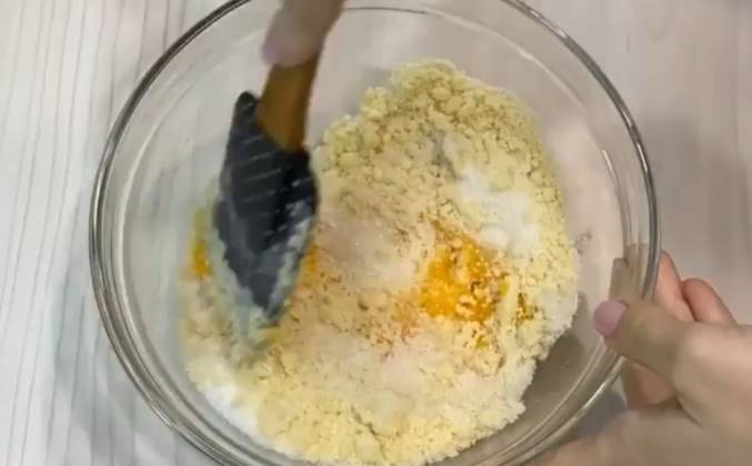 2. Печенье: Муку с мягким сливочным маслом перетираем до состояния крошки. Добавляем сахар, яйцо и замешиваем мягкое тесто. Формируем прямоугольник длиной 19 см, шириной 11 см и толщиной 1 см.