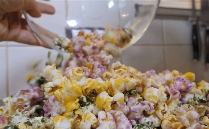 2. После я стал добавлять больше масла, а также сливочное и закидывать в момент первого взрыва. Как итог - все сгорело. На этом я не остановился уже стал готовить на кокосовом масле и закидывать в середине процесса и активно перемешивать. Как итог - все почти сгорело. На вкус - ужасно! Я подумал что сошел с ума... и посмотрел еще раз видос из TikTok, а также посмотрел youtube и подумал что может дело в том что нужно готовить именно со скитлз. Как итог - все сгорело. Ну и моя мудрая жена сказала что нужно добавлять уже готовый попкорн и не перемешивать вот из этого что-то уже и получилось. Оно уже не сгорело, слегка окрасила соседние зёренки, но смысла и вкуса в этом нет. Я правда устала снимать и выкидывать кучу попкорна M&Ms, что бросил попытки.