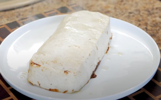 3. Красотища! Все это дело неплохо держит форму. Попробуем нарезать. Куриное суфле готово! И всего здесь у нас получилось примерно 120 г белка, 16 г жиров и 9 г углеводов, что составляет 660 килокалорий. Весит это суфле 615 г. И на 100 г здесь приходится примерно 19,5 г белка, 2,5 г жиров и 1,5 г углеводов, что составляет 107 килокалорий. Самое время его попробовать. Блюдо очень хорошо держит форму. Его можно смело использовать вместо колбасы. Благодаря наличию молока суфле получилось очень воздушное и не сухое.