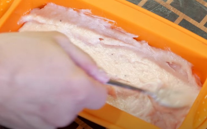 2. И аккуратненько взбиваем до однородного состояния. В итоге у нас получился очень симпатичный фарш. По цвету он чем-то напоминает докторскую колбасу. Перекладываем все это дело в форму для запекания. Я буду использовать вот такую вот небольшую силиконовую форму. Все это дело надо хорошенечко притрамбовать. Ну и в конце форму можно немножко обстучать, чтобы ушёл лишний воздух. Духовка прогрелась до 200С, отправляем туда суфле минут на 40. 40 минут прошло, перевернем и посмотрим, что же получилось.