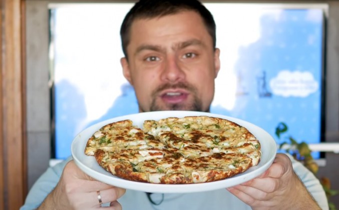 3. И сделать это проще всего через тарелочку. Накрываем крышкой и еще буквально 5 минут обжарим с другой стороны. Еще 5 минут прошло. Ну и точно таким же образом перекладываю пирог обратно на тарелку. Пирог в стиле шавермы готов! И всего здесь у нас получилось примерно 85 г белка, 35 г жиров и 65 г углеводов, что составляет 915 килокалорий. Весит этот пирог 470 г. И на 100 г здесь приходится примерно 18 г белка, 7,5 г жиров и 14 г углеводов, что составляет 195 килокалорий.