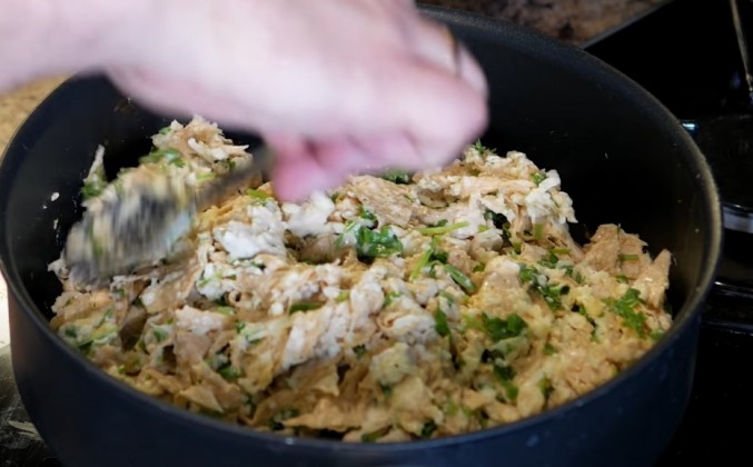 2. Сюда же к лавашу добавляем йогурт, через пресс выдавливаем 2 зубчика чеснока, разбиваем 1 яйцо, закидываем тертый сыр, немного молотого перца. Соль сюда добавлять не буду, потому что сыр уже даст соленый вкус. Свежую зелень измельчаем и отправляем ко всем остальным продуктам. Ну и у нас как раз обжарилась курочка, отправляем ее в общую копилку. Хорошенечко все это дело перемешиваем. Отправляем все это дело на ту же самую сковородку. Хорошенечко притрамбовываем. И под крышкой жарим пирог 10 минут на среднем огне. 10 минут прошло, пирог зажарился снизу. Сейчас я хочу его перевернуть и зажарить с другой стороны.