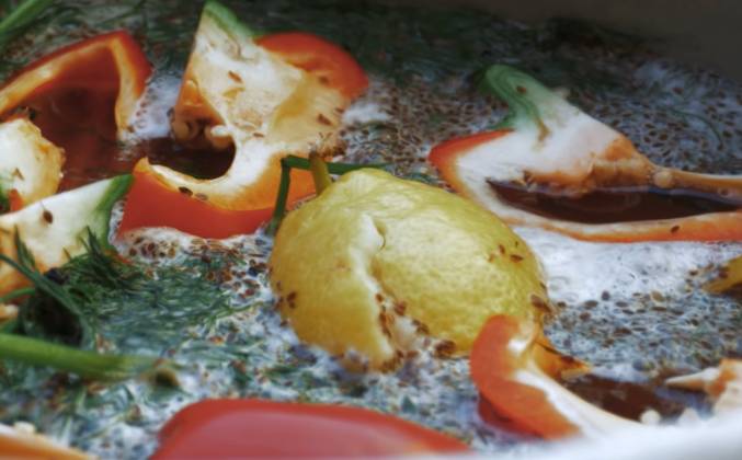 2. Это как бы основной ингредиент нашего бульона его нарезаем произвольной формы, можно пополам, можно на четвертинки вместе с плодоножками есть мы их не будем, они отдадут блюду особый аромат, мы их потом уберем .Чем больше болгарского перца тем бульон будет насыщеннее и ароматнее соответственно раки будут вкуснее перец болгарский можно брать любой: зеленый с огорода без разницы в нашем случае перец светофор взяли желтый и красный, а так значение имеет какой и последний ингредиент это лимон. Режем пополам, выжимаем сок лимона и лимон кладём тоже в бульон, чтобы корка отдала свой привкус. Ингредиенты мы заложили перемешаем их и оставим закипать. Займемся теперь нашими раками - помоем и удалим у них кишечник перед тем как готовить раков, надо хорошенько промыть у раков нужно удалить кишечник, чтобы после процесса варки вам не пришлось лишнюю работу делать и ковыряться. Показываю: берете рака со стороны головы , вот так его оттопыриваете хвост, на хвосте у него 5 лепестков, средний лепесток называется по-научному тельсон нужно сделать надрыв вправо и влево и потянуть и кишка власть.