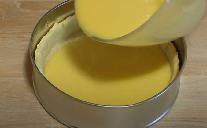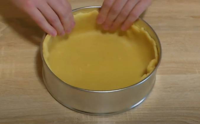 2. С помощью нижней части формы для выпечки формирую основу для пирога. основа мне нужна с высокими бортиками, поэтому диаметр основы пирога вырезают на 5 см больше диаметра нижней части формы для выпечки распределяю тесто по форме, накалываю вилкой и буду запекать 15 минут при температуре 200 градусов.